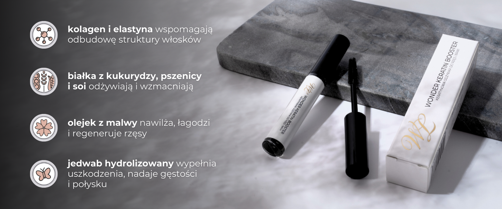Odżywki do rzęs: Produkty bogate w witaminy, peptydy i keratynę mogą pomóc wzmocnić rzęsy. Polecamy odżywkę Wonder Keratin Booster, która odżywi Twoje rzęsy i brwi.