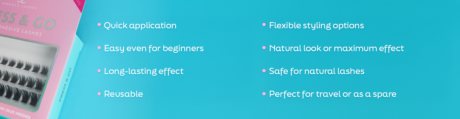 Discover PRESS & GO – innovative self-adhesive lashes that completely change the way you style your eyes. Each cluster already has an adhesive layer on its base – you don’t need any additional products or special skills to achieve a perfect look in just a few minutes. It’s the ideal solution for busy people, beginners, and anyone who values convenience, speed, and stunning results.
