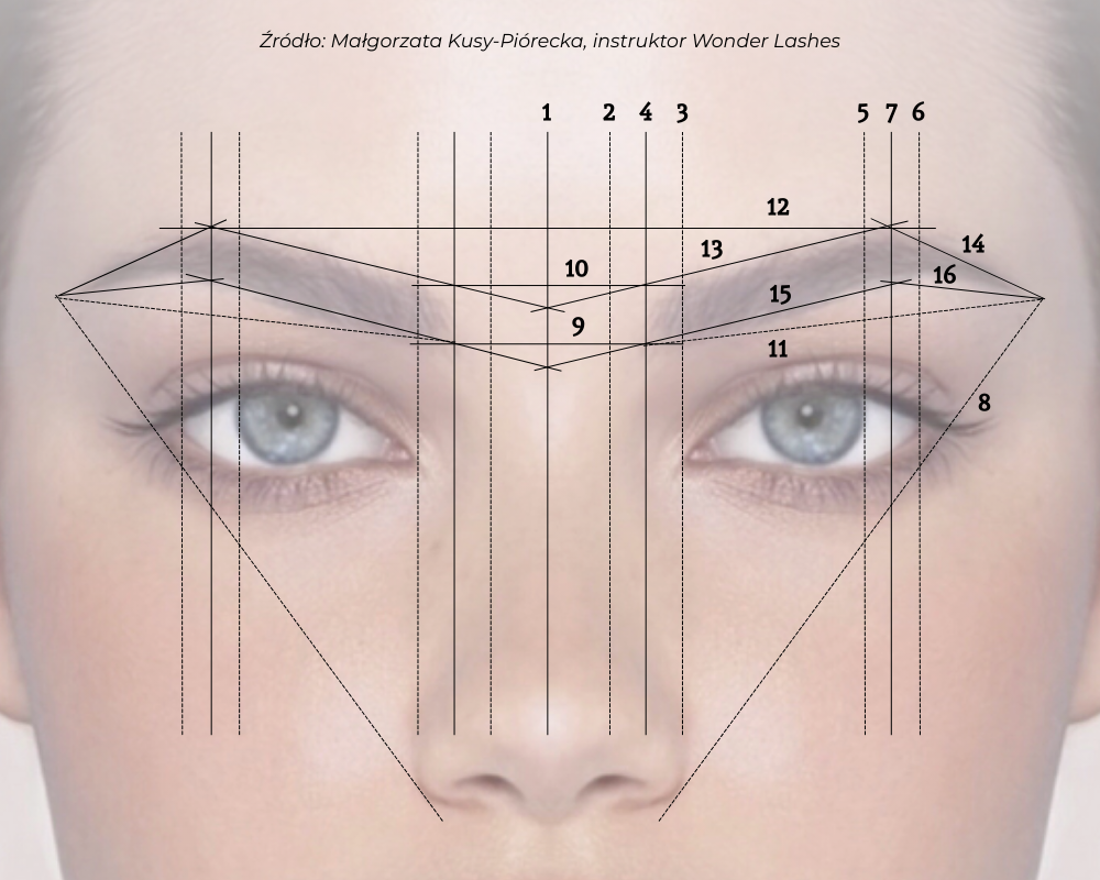 Wyznaczenie perfekcyjnego kształtu brwi opiera się na kilku kluczowych punktach konstrukcyjnych oraz liniach pomocniczych, które pomagają zachować proporcje i symetrię. Odpowiednie rozmieszczenie początku brwi, najwyższego punktu łuku oraz jej zakończenia pozwala stworzyć harmonijny kształt dopasowany do twarzy klientki.