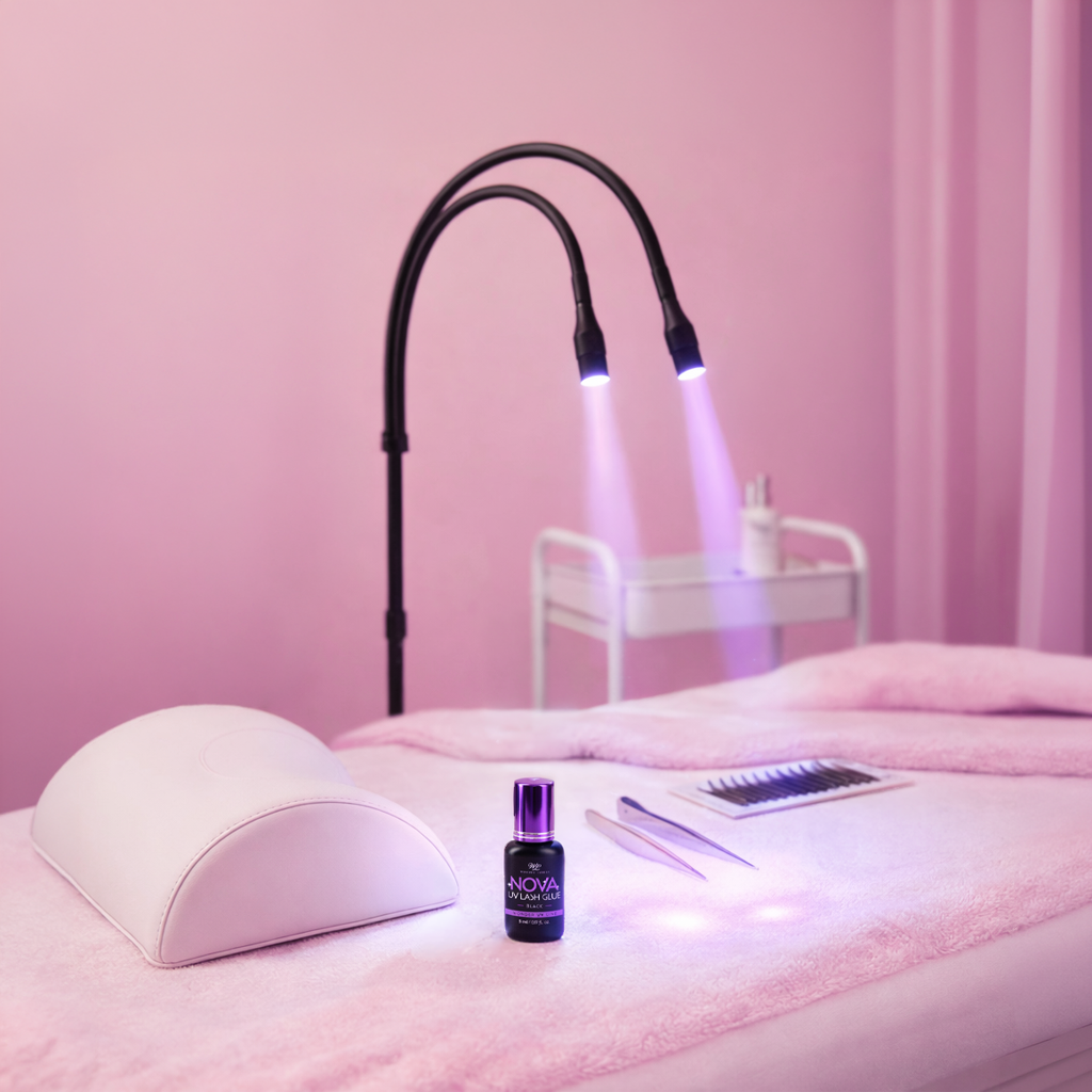 Metoda UV to nowoczesny system aplikacji rzęs, w którym klej utwardzany jest światłem lampy UV/LED - dokładnie w momencie, kiedy tego potrzebujesz. W przeciwieństwie do tradycyjnych klejów cyjanoakrylowych, które reagują na wilgotność i temperaturę, klej UV wiąże dopiero po naświetleniu. Daje to stylistce pełną kontrolę nad aplikacją.
